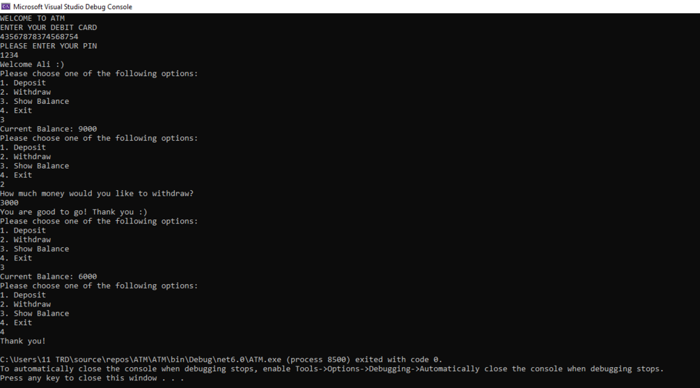 An ATM (Automated Teller Machine) Console Application in C# developed using Visual Studio is a software program that simulates the functionality of a real-world ATM. This console application allows users to interact with it through a command-line interface to perform common banking operations, such as: